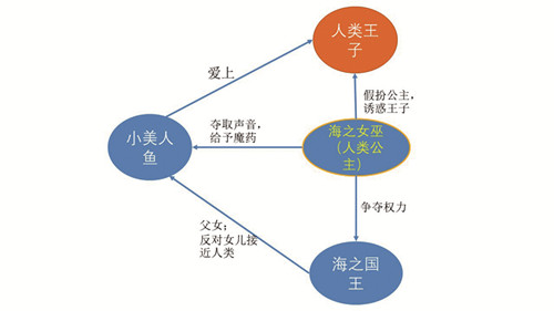 这个著名的爱情故事曾被捷克斯洛伐克、保加利亚、日本等国改编为电影和动画作品。美国迪士尼公司也在1989年拍摄了动画电影版的《小美人鱼》。“小美人鱼失去了爱情和生命,不过在300年后,她将获得一个不灭的灵魂。”——为了削弱原作故事中的悲剧色彩以适合孩子们观看,迪士尼版本的故事在保持原作基本情节的基础上,做了极大程度的改编。下面两图表示的是原著中的人物关系: