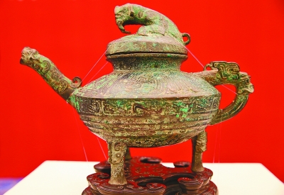 交接仪式上,记者看到,这尊青铜“虎鎣”的样子有点像三只足的偏圆形茶壶。它的管状流也就是出水口,被做成伏虎的样子,这也是“虎鎣”名字的来由;与流对应的另一侧,是它的鋬,也就是把手,被塑造成龙头的样子;它的盖子上有圆雕踞虎形装饰,盖子与鋬上各有小环钮。孙机说,原来应该是用链子连在一起的,可惜现已佚失了。“虎鎣”的肩部装饰着卷曲夔纹,腹上部饰有横S形斜角云纹,腹下部饰瓦纹,三只足的根部饰饕餮纹。