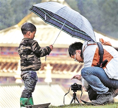 还有一张照片,被我珍藏了很久。那是我在藏区,当时我外出拍摄,遇到了下雨。以我的性格我是不会选择停工的,虽然没法进行航拍,但是延时摄影还是要坚持做的。我把我的伞让给了相机,自己淋雨操作。一个藏族的小孩子看到我当时的样子,主动帮助我打伞,而他自己的身体倒是有一大半在外面淋着。我的同行伙伴,帮我记录了这个瞬间。