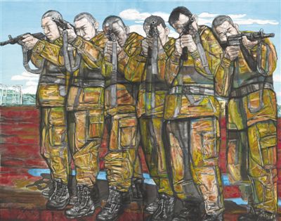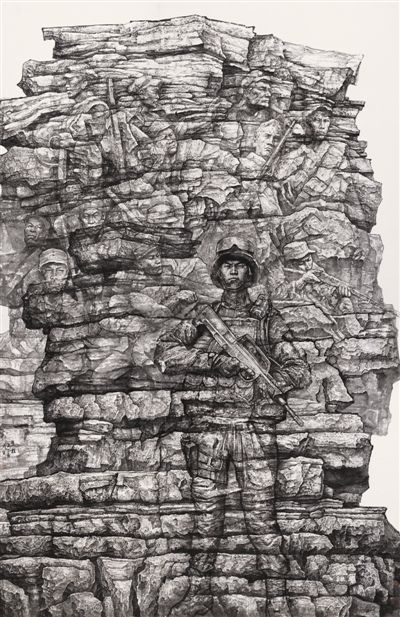 艺术地表现建设现代化武警部队的火热实践,多方位多层面体现武警官兵忠实履行职责使命、争做党和人民忠诚卫士的精神风貌的作品感人至深。例如,中国画《训练日志》通过对士兵形象的悉心刻画和训练场景的生动描绘,再现了昂扬的战斗风采与蓬勃的生命状态,折射出武警官兵忠实履行职责使命的精神品格;中国画《历程》将个性化的绘画语言与武警部队担负的职责紧密结合,借助雕塑的形式感,强化“碑”的意象和“石”的力度,用一种既具象又象征的方式,展现当代武警精神风貌。