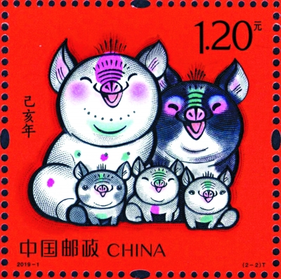 邮票第一图为“肥猪旺福”,肥猪肚藏乾坤,憨态可掬,以奔跑的动态表现灵动生风的喜感,象征着正在奔向美好的生活;第二图为“五福齐聚”,是首次在一枚生肖邮票中完整体现“全家福”的概念,两只大猪和三只小猪同时出镜,其乐融融,寄托新春佳节合家团圆、五福临门的美好祝福。