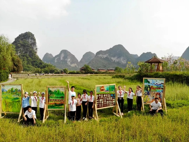 而以张杰为首的艺术家们,则为孩子们带来了一堂主题为“美从何处寻”的艺术课。张杰在课堂上与孩子们交流生活中最美的人、事、梦等意象,引导孩子们用艺术的眼光去观察生活,感受身边的爱与美,并发挥联想能力,将心中的“最美”以绘画的形式还原出来。在课堂内容结束后,艺术家们领着孩子们前往闻名靖西的风景点鹅泉,进行艺术课的“实战演练”。