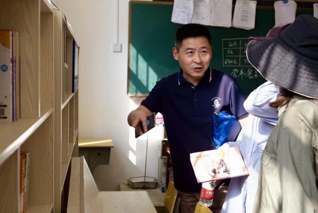 在大莫村弄关民族小学图书室,与扶贫采风团探讨乡村教育发展的中华文学基金会副秘书长安亚斌 摄影:赵卫国