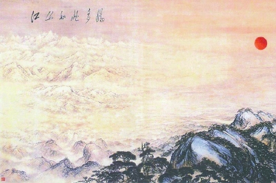 1959年傅抱石与关山月联袂为人民大会堂创作巨幅国画,精心描绘《沁园春·雪》所表现的壮美河山,毛泽东亲自为该画题款“江山如此多娇”