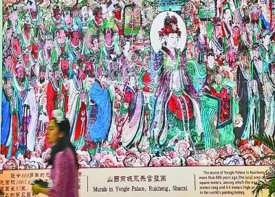 参观者从文博会现场展示的山西芮城永乐宫壁画动画前走过。新华社记者 毛思倩摄
