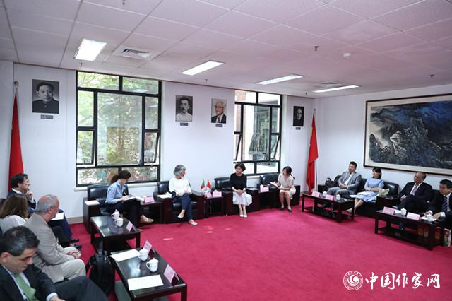 论坛开幕前,电竞竞猜官网主席铁凝与葡萄牙文化部长丰塞卡亲切会谈,中葡两国作家代表参加会谈
