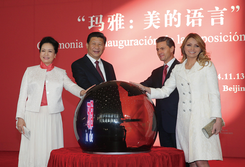 2014年11月13日,国家主席习近平同墨西哥总统培尼亚共同出席在国家博物馆举行的“玛雅:美的语言”文化展开幕式。这是习近平和夫人彭丽媛与培尼亚夫妇一同为展览剪彩。 新华社记者 刘卫兵/摄