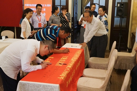 作家们在采访团旗上签名留念