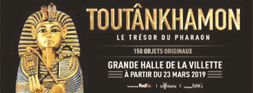 今年从3月23日至9月15日,巴黎用近半年时间再度在维莱特人文科学宫的中心大厅,展出150件图坦卡蒙墓出土文物,其中大部分是首次离开故土,吸引全球观众前来。人们走进展厅,最先看到的是图坦卡蒙狩猎羚羊的木雕像。年轻法老凌驾在一头黑豹背上,头戴埃及法老王冠,威风凛凛,象征猛兽的凶焰和敏捷,显示其统治地位的稳固。雕像两边面对面站立着一对哨兵,是霍华德·卡特深入陵墓在北墙发现的。两哨兵均呈图坦卡蒙面貌,守卫着法老寝室正门。他们额头上各挺出一条黄铜眼镜蛇,形态咄咄逼人,脖项上紧箍项链,下面垂着一个展翅金甲虫胸饰。二人双目炯炯,与涂沥青的黑色胴体相映,显示尼罗河两岸沃土的颜色。