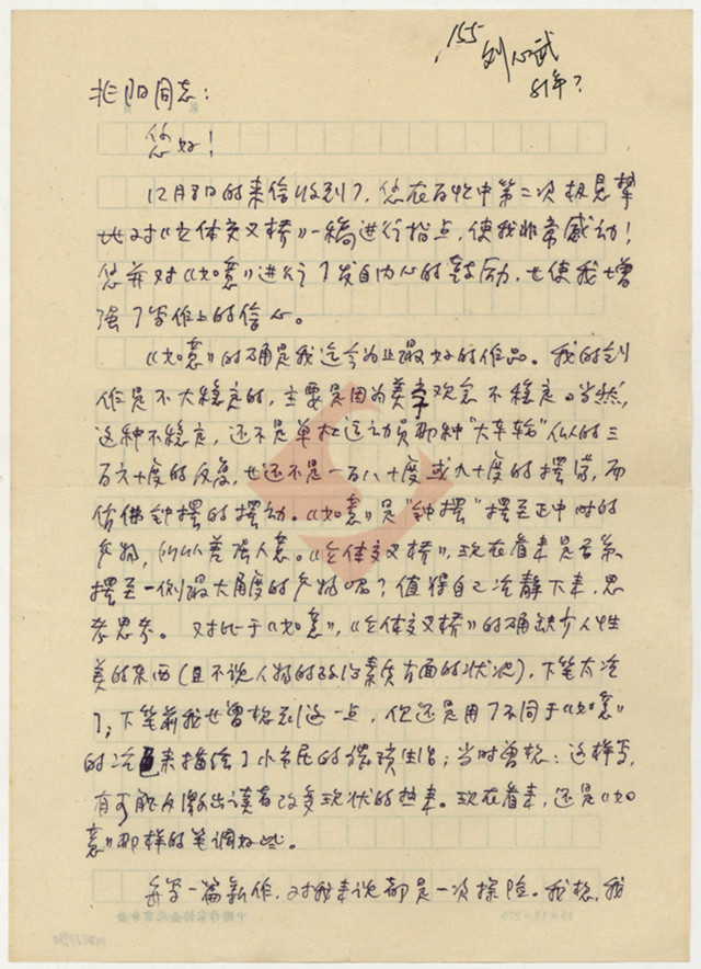 12月8日的来信收到了,您在百忙中第二次极恳挚地对《立体交叉桥》一稿进行指点,使我非常感动!您并对《如意》进行了发自内心的鼓励,也使我增加了写作上的信心。