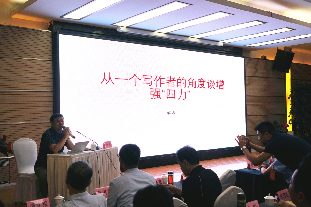 专题讲座《从一个写作者的角度,谈增强“四力”》令学员们感到耳目一新。主讲人杨克结合自己创作的诗歌《我在一颗石榴里看见了我的祖国》《南海海眼》《我的中国》等文本阐释了作家如何创造性地使用“四力”,通过切身感受分享了内容丰富的创作方法论。他更列举徐志摩、舒婷、李洱等诗人和作家的创作故事,通过这些直接或间接的写作案例阐释了他的美学观点。