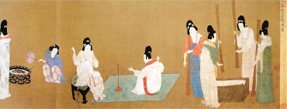 《捣练图》原来由圆明园收藏,后流失海外,现藏于美国波士顿博物馆。它描绘的是贵族妇女捣练缝衣的场景。古代用生丝制衣,但生丝编织起来容易滑脱,所以在织前,先用捣锤把丝织品敲扁,然后还要经过脱胶的程序,这样可以使丝织品表面变得致密。在这幅长卷式的《捣练图》中,一共画了12个人物形象,按劳动工序分成捣练、织线、熨烫三个场面。