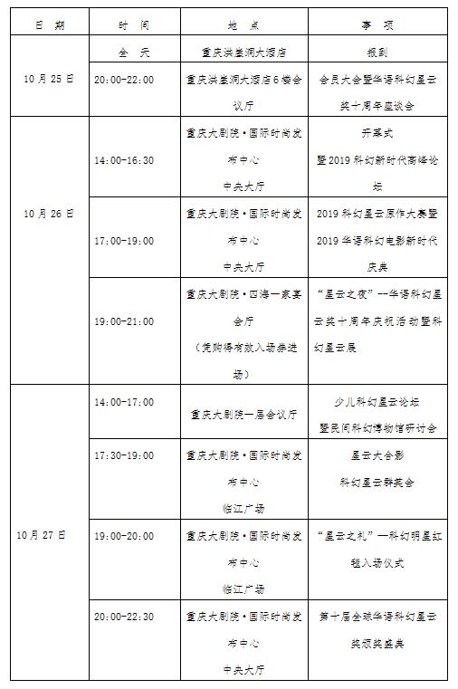本次活动将由第十届全球华语科幻星云奖颁奖典礼、科幻星云群英会、第二届科幻电影星云奖颁奖典礼、2019科幻星云原作大赛、2019黄金星云科幻论坛等部分组成。为方便受邀嘉宾与已报名人员参会(因场地有限,不再接受新的报名),特将日程安排公布如下: