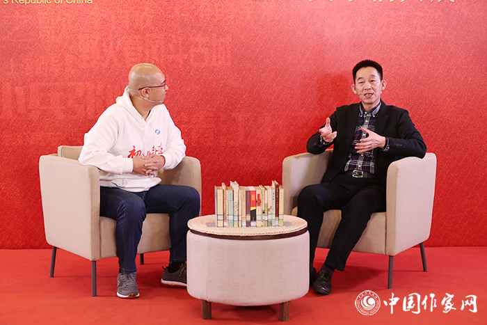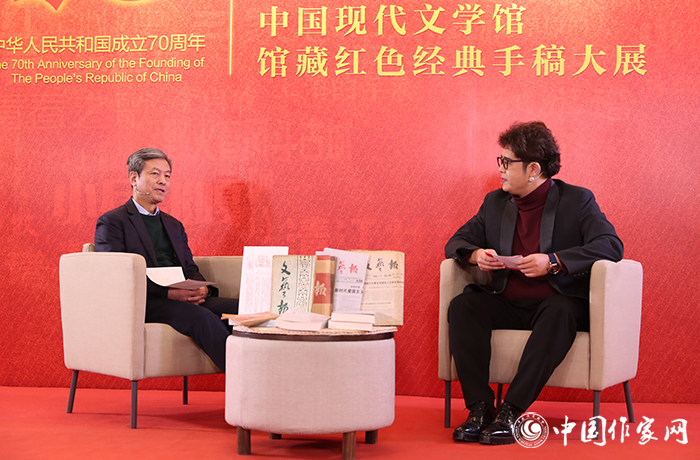 梁鸿鹰(左)介绍《文艺报》创刊背景