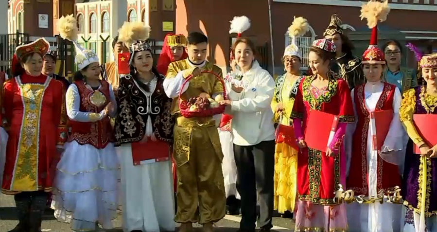 新疆塔城的少数民族朋友一同朗诵起《天山牧歌》中的《赛马》