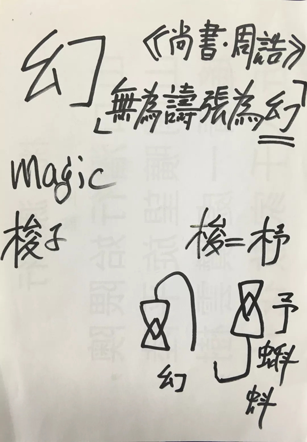 流沙河:“幻”就是变化的意思,变得你完全认不出来了。我来画给你看。这个字古代就有了。古代见于《尚书》,三千年了。这是原文,周朝政府下的命令,谎言为幻,用来骗人,指的是什么?就是周公那时候,社会上有很多变魔术的人,后来把魔术叫作幻术。周代的人不准许这个,所以这个“幻”字已经非常古老,研究文字发现它是这样来的。这个字就是“幻”。