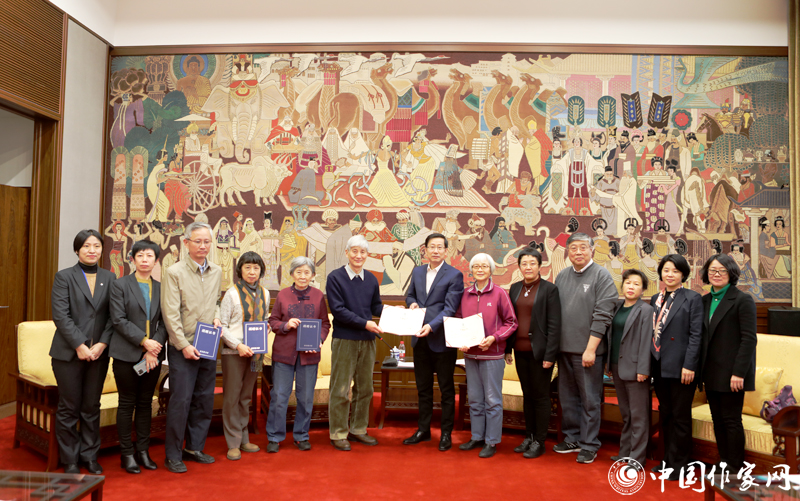 国家图书馆馆长饶权代表国图接受捐赠并向杨晦先生子女颁发捐赠证书