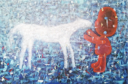 今年恰逢内蒙古首届国际马文化博览会举办,内蒙古自治区上下都在为弘扬蒙古马精神、建设新时代的内蒙古而殚精竭虑,本次展览正好契合了这个主题。什么是蒙古马精神?我以为就是自强、乐观、自由、宽容、脚踏实地、不畏艰苦、团结奋进。纵观展出的作品,我确实感受到了艺术家们对蒙古马精神的独到理解和阐释。形式上,他们不拘泥于马的具象化表征,摒弃了模式化的创作思维,而更多的是以或抽象、或卡通、或具有符号化的,甚至是变形的方法,表现马的形态和生命内涵,以及马所象征的人的精神力量。在艺术手法上他们更是大胆尝试,不光有油画、丙烯、水彩、国画、木刻、雕塑还有铜版画以及马克笔绘制的作品。比如金刚的《鞍马史诗》 ,用旧马车的辕木、旧马鞍和马饰以及废弃的门板组合成马的几何形状,给人一种古朴的空间感和时间感。吴智彬的《浮城》则以马克笔细密的笔触描绘了一个既逼真又幻象的超现实世界。苏德巴特尔的油画《战神》将传统装饰与现代卡通融为一体,描摹了以长生天和战马为核心的蒙古精神,极具想象力。青格尔的油画《蒙古脸谱》给我印象尤为深刻,他以仿蒙古族传统皮雕的形式,将漫画和装饰画的笔法融入他的构图,那一个个挤压在似烟囱和管道中的脸,隐喻了现代性与游牧文明的冲撞和融合。展览策展人莫尼的作品也给人与众不同的感受,他的油画《沉默的他们》系列作品将代表草原游牧精神的马与当代社会的众声喧哗进行比照,使沉默产生了形而上的寓意。而另一位策展人朝鲁的油画《骑士》 ,则借鉴了古代壁画和岩画的形态,粗粝而富有历史气息。孙玉宝的《冬牧》以现代水墨的手法,表现了在严酷的自然环境中牧人与马的依存关系。而钱达木尼的丙烯《寻· 3》中的马被赋予了蒙古族人崇尚的蓝色,将马的姿态、节奏与大自然的绚烂融为一体,具有很强的表现主义风格。靳双双的油画《花花世界的幻想》则是一个“90后”城市女孩对马和牛的奇妙的想象,画面清新、淡雅,有水彩般的透明感。此外,油画或丙烯类还有芬笋得日的《无声的自述》 、李旭东的《晨曲》 、旭日花的《草原印象》 、白嘎力的《浮影》 、孟和琪琪格的《静谧》 、苏龙嘎的《梦》 、旭日嘎的《15℃》以及段琦琦的《同在》 ;国画有海日汗的《天灵》 、敖宝林的《鬃飞》 、孟和乌力吉的《蓝骑士》 ;雕塑有萨其日拉图的《牧马人系列:初恋》 、高贝的《敕勒川印象》 、岳布仁的《草原恋》 ;水彩有那日苏的《风马》 ;版画有伊兰纳的A t T h a t M o m e n t等,这次展览既以“80后” “90后”为主体,又以上世纪五六七十年代出生的艺术家为先导,形式多种多样,内容丰富多彩,受到社会各界的关注和好评。
