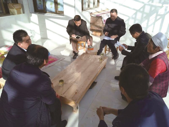 高凯、王志祥等在羊永镇白土村二社王石山保家调研安全饮水事宜。 王晓忠 摄