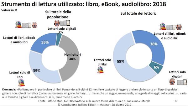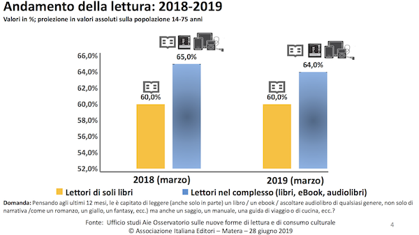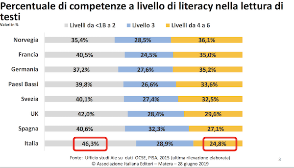 2019年,意大利出版商协会成立150周年。7月28日,协会主席Ricardo Franco Levi发表讲话,题为“意大利出版社现状、读者情况、销售情况以及新的电子化领域”(若无特别指出,以下数据皆来自于该文件)。讲话的开头便援引了经济合作与开发组织的2015年PISA项目数据。