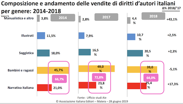 而就版权销售而言,意大利图书市场也有增幅,主要是儿童图书以及叙事文学类,其在整个版权市场中所占比例,在2018年达到了64%。