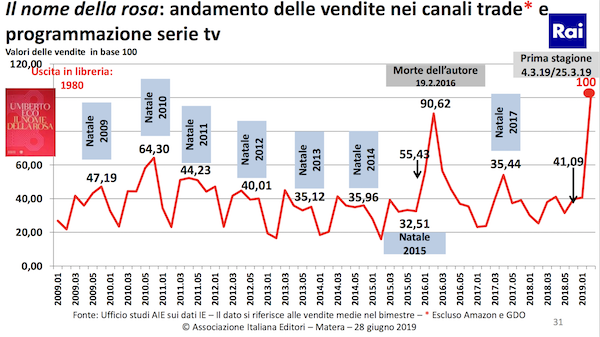 意大利出版社协会的数据是多方位的,有意思的是,协会还列出了书籍周边市场。比如,以翁贝托·埃科的名著《玫瑰的名字》(或译《玫瑰之名》)而言,协会给出了该书从2009年至2019年3月的销售波动数据,以2019年3月的销量为基准值100: