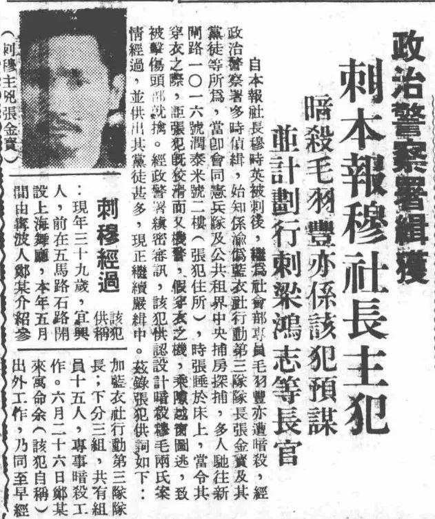 自本报社长穆时英被刺后,继为社会部专员毛羽丰亦遭暗杀,经政治警察署多时侦缉,始知系渝伪蓝衣社行动第三队队长张金宝及其党徒等所为,当即会同宪兵队及公共租界中央捕房探捕,多人驰往新闸路一〇一六号润泰米号二楼(张犯住所),时张睡于床上,当令其穿衣之际,讵张犯既狡猾而又机警,假穿衣之际,乘隙越窗图逃,致被击伤头部被擒。经政署缜密审讯,该犯供认设计暗杀穆毛两氏案情经过,并供出其党徒甚多,现正继续严缉中。兹录张犯供词如下: