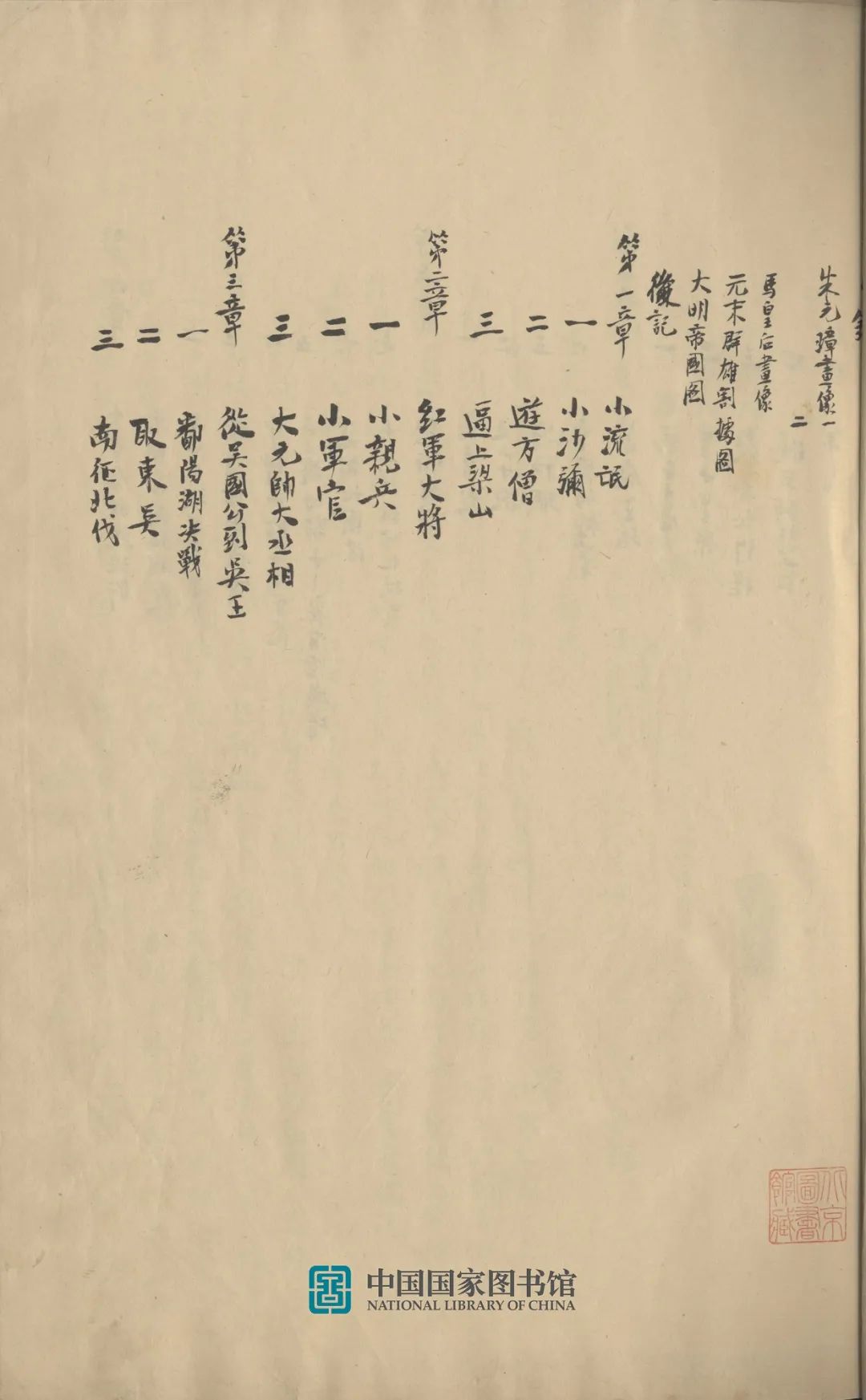 国家图书馆收藏的《朱元璋传》手稿,是1948年写成的版本,1954年吴晗任北京市副市长时亲自捐赠。该手稿为毛笔手书,封面、目录、封底、后记5页,正文136页,共计141页,分四册线装,正文有较多修改。稿件封底有几行钢笔草书,字迹潦草,大意是:一,彭莹玉的下落是消极的、道家的,称赞不当;二,国家机器由军队、法庭、特务机构等组成,而不是由官僚机构和军队组成;三,朱元璋由农民阶级转变为地主阶级,不是由个人的人性物欲决定的,团体利益决定个人利益。其右有吴晗1954年4月1日毛笔手书说明,这则札记写于1948年12月毛泽东与吴晗在西柏坡面谈之时,所记即毛泽东对《朱元璋传》的修改意见。