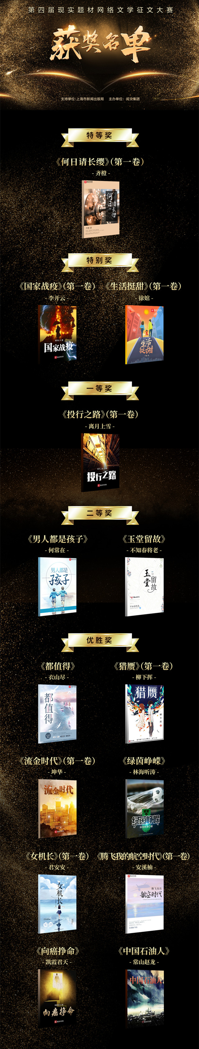 5月1日,由上海市新闻出版局指导,阅文集团旗下多家原创文学网站联合主办的第四届全国现实题材网络文学征文大赛获奖名单公布。聚焦中国工业发展史的《何日请长缨》获特等奖;反映金融资本行业发展的《投行之路》获一等奖;根据疫情期间真实事件改编的《国家战疫》、聚焦医护工作者的《生活挺甜》获特别奖。