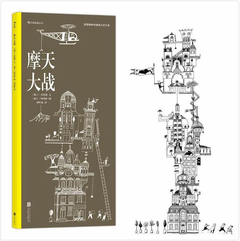 《摩天大战》与《挚爱之书》可以看到艾伯丁显著的插画理念,前者从一个由摩天大楼引起的现代寓言出发,讲述了人类无止尽的攀比欲望,独特的超长开本设计,与书中的摩天大楼相互辉映,内页也全部只用黑白两色。后者同样是一本黑白色调的作品,通过一位母亲和儿子之间放大缩小来呈现一段情感故事,不断变化的身体比例充满了游戏趣味,其背后是作者在讲述生命传承,周而复始的爱与时间的故事。就像她本人所解释的,“其实我和Germano共同创作的许多作品,都是在讲‘传承’这个命题:如此美妙,如此神秘。”