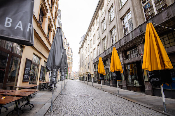 4月4日在德国东部城市莱比锡拍摄的一条空无一人的餐饮街(图片来源:新华社)