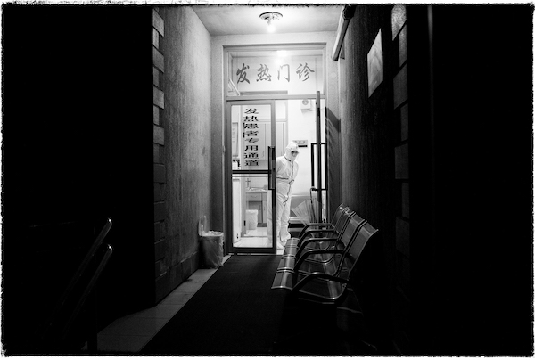 雍和(上海市摄影家协会主席) :我在大年三十的晚上拍下这张照片,时间节点是上海一级响应的时间。这张照片不是我刻意拍的,那天正好去医院探望朋友,就在发热病房外拍了一张照片。我拍照没有条条框框,只是看到一个点就拍了。就这样拍,从那天拍到今天为止,106天我没有间断。我的创作目的很简单,只要能为历史、为上海这座城市留下一点记录就行了。