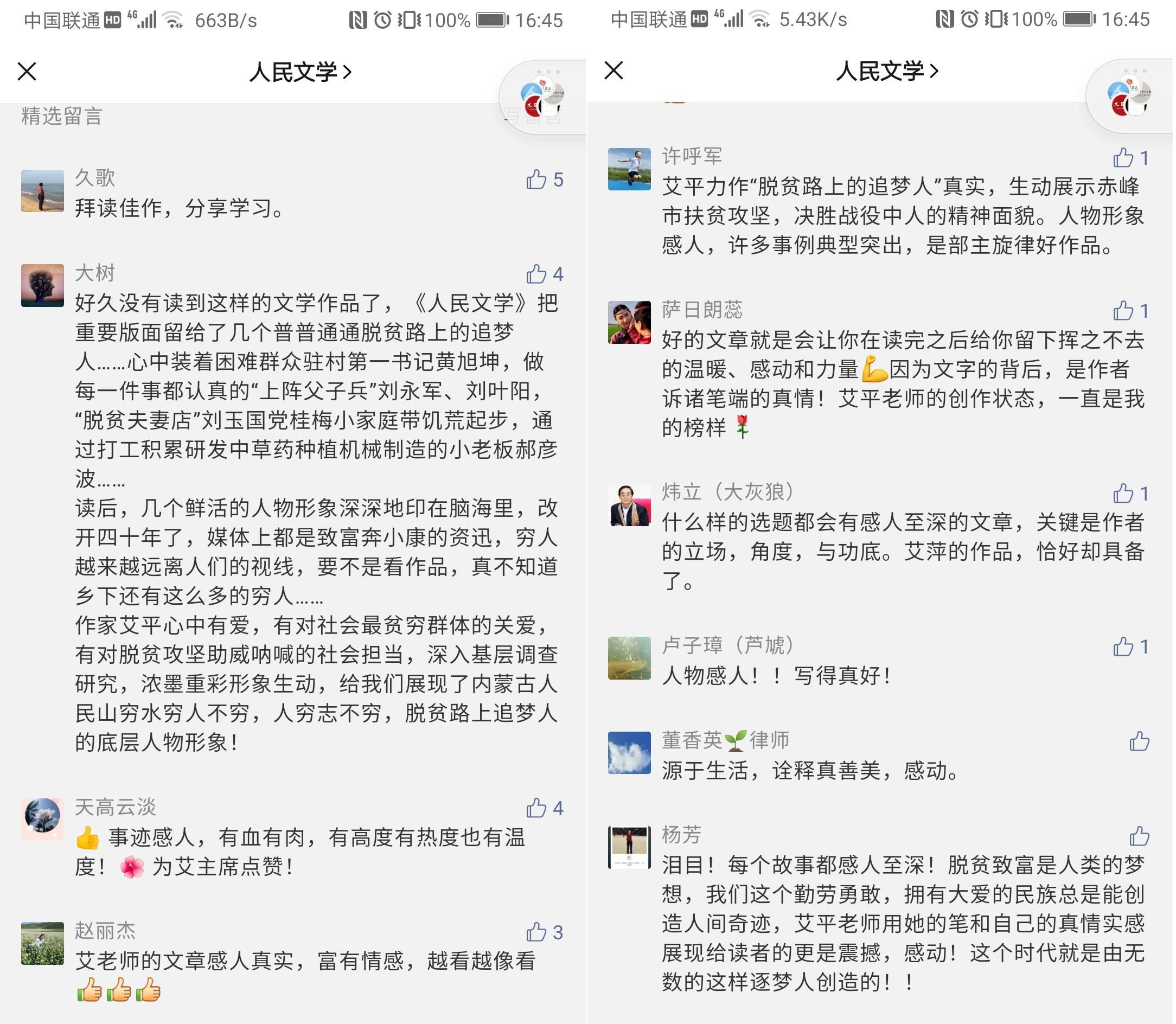 “人民文学”微信公众号推出艾平《脱贫路上追梦人》后的网友留言