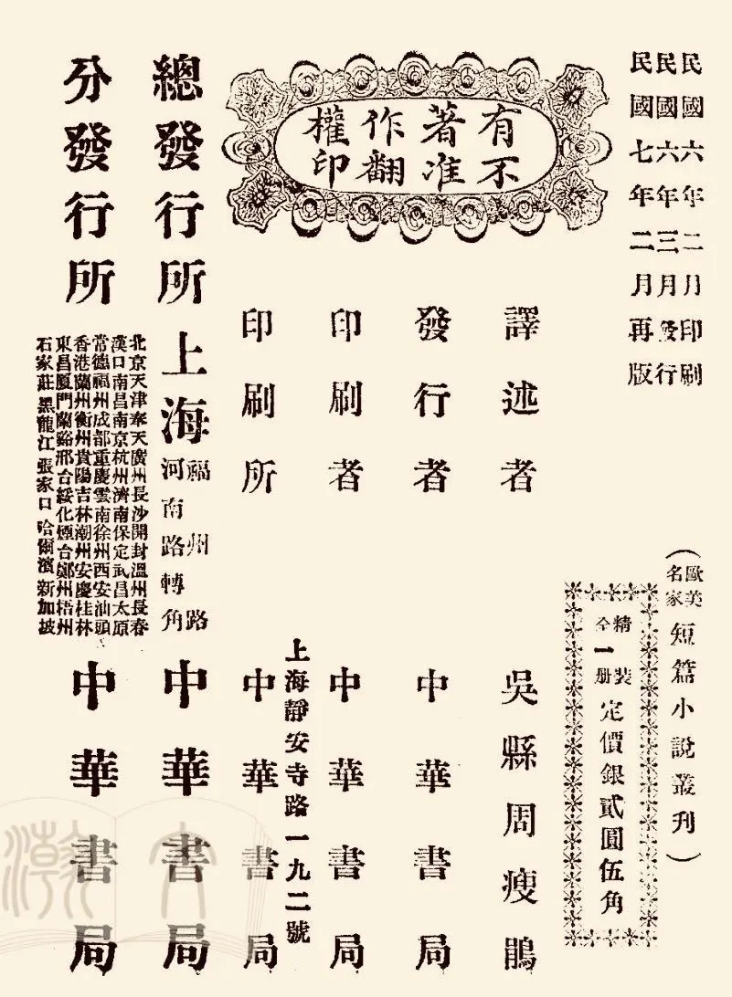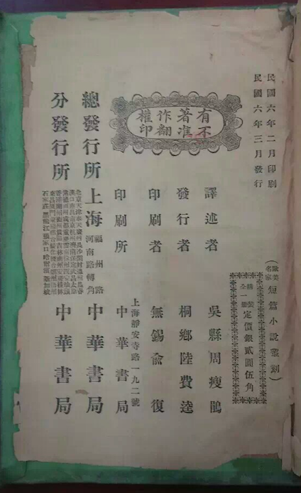 遗憾的是,两处均未附版权页。但基于现有材料,可以对版权页信息进行进一步推测和佐证。由于精装初、再版,精、平装四版各自版权页所署最早印刷和发行时间全部一致,均为“民国六年二月印刷 民国六年三月发行”,而周瘦鹃所说后出的精装本虽然在时间上落后于平装本,但既然同称初版,且未更换出版社(同为中华书局),未发生版权交接,因此不能因为精装本略后而于版权页上另署一印刷和发行时间,这样就延后了一本书的初版时间。加之,民国图书“每印一次称做一版” ?,若精装本所署发行时间后于平装本,那就不能称初版,而只能称再版了。因此,笔者认为该书平、精装本在发行时间上是没有差别的,即平装初版发行日期也应为1917年3月。