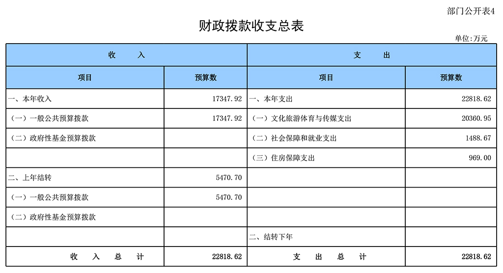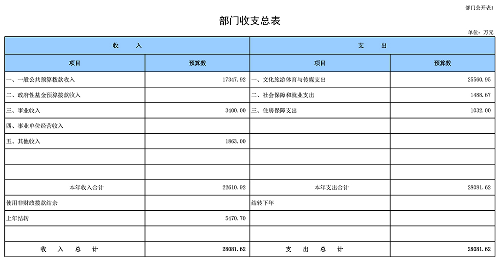 按照综合预算的原则,电竞竞猜官网所有收入和支出均纳入部门预算管理。收入包括:一般公共预算拨款收入、事业收入、事业单位经营收入、其他收入、上年结转。支出包括:文化旅游体育与传媒支出、社会保障和就业支出、住房保障支出。