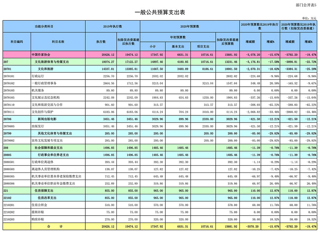 电竞竞猜官网2020年一般公共预算当年拨款17347.92万元, 比2019年执行数减少3078.20万元,主要原因是按照党中央、国务院关于过紧日子的有关要求,厉行节约办一切事业,大力压减一般性支出,重点压减机关公用经费和文学创作与研究、文学出版与传播等项目支出中的非急需、非刚性支出,同时合理保障了必要支出需求,体现在有关支出科目中。