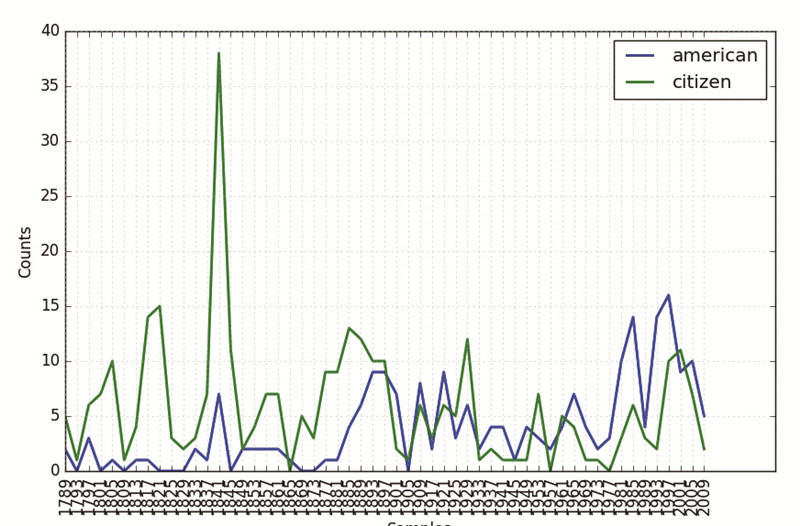 在官方相关示例中,一些独特的研究结果已经被呈现出来,例如,在不同时代的美国总统演讲中,总统想强调的重点自然不同,那么“citizen”和“american”两词的使用频率有什么变化?有关研究人员对其进行了一种可视化呈现。