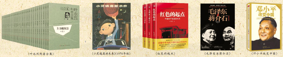 左起:《叶永烈科普全集》;《小灵通漫游未来》(1978年版);《红色的起点》;《毛泽东与蒋介石》;《邓小平改变中国》
