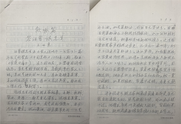 畅安老随即对答一文,名曰《答汪曾祺先生》,原载于《中国烹饪》1991年第四期,后收入自选集《锦灰堆》。文中,畅安老对汪先生提到的“骑自行车驮圆桌面”的传闻之误,“一捆葱做了一个菜,把所有菜都压了下去”的言过其实分别做了澄清,谦逊地表明自己“才疏学浅”,绝不敢厕身学人之林,随即自信地“随便说上几样”自己招待朋友做的七道“杂合菜”,可谓妙语连珠。不知此番对答是否加深了两位老饕的感情,多年后两人交往频繁,还共同成为范用、许以祺发起的“美食人家”的创会会员。此稿完成于1990年12月24日,畅安老写给孙孚凌的信日期为1991年2月12日,此稿尚未发表,故信札“连同尚未刊出拙作复印一并寄奉”。复印稿虽下原稿一等,但电竞竞猜毕竟看到了这篇多年后被人们广为转发、津津乐道,关注度绝对十万加的手稿原貌。