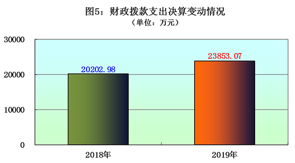 2019年度财政拨款支出23853.07万元, 占本年支出合计的80.18%。与2018年相比,财政拨款支出增加3650.09万元,增幅18.07%,主要是文化旅游体育与传媒支出中的一般行政管理事务和社会保障和就业支出中的机关事业单位职业年金缴费支出增加。