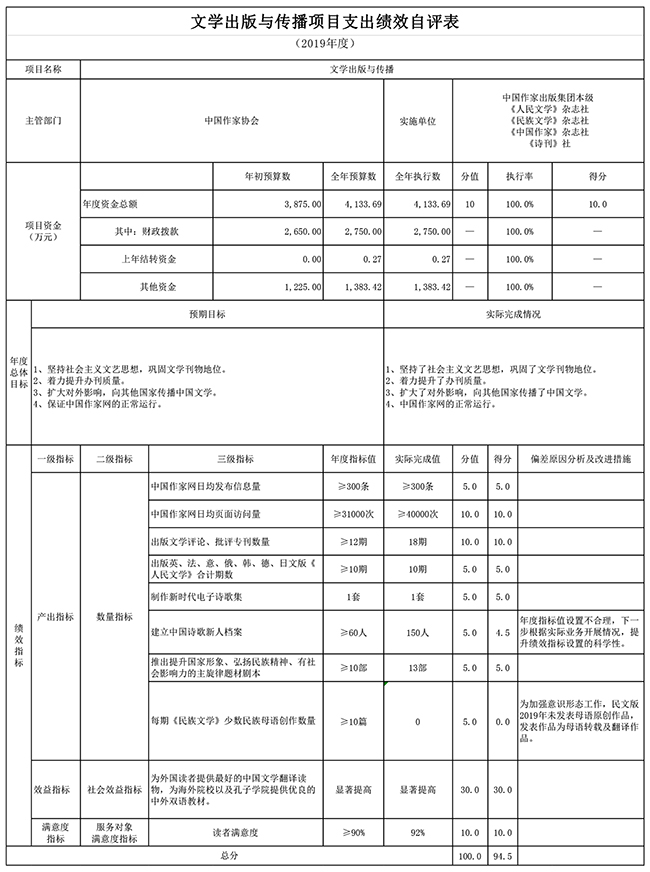 2.“文学出版与传播项目”绩效自评综述:根据年初设定的绩效目标,项目自评得分为94.5分。项目全年预算数4133.69万元,执行数为4133.69万元,完成预算的100.0%。项目绩效目标完成情况:坚持了社会主义文艺思想;巩固了主要文学刊物的主导地位,着力提升了办刊质量;扩大了中国文学的对外影响,向其他国家传播了中国文学;电竞竞猜官网正常运行。发现的问题及原因:一是部分绩效指标设置不合理,不利于绩效评价和实际工作的开展,预算执行过程中完成难度较大;二是文学刊物的质量需要进一步提高。下一步改进措施:增强对于绩效指标科学性的设置,根据项目目标要求和实际工作开展情况,设置合理的绩效指标,着力提升文学刊物的创新性。