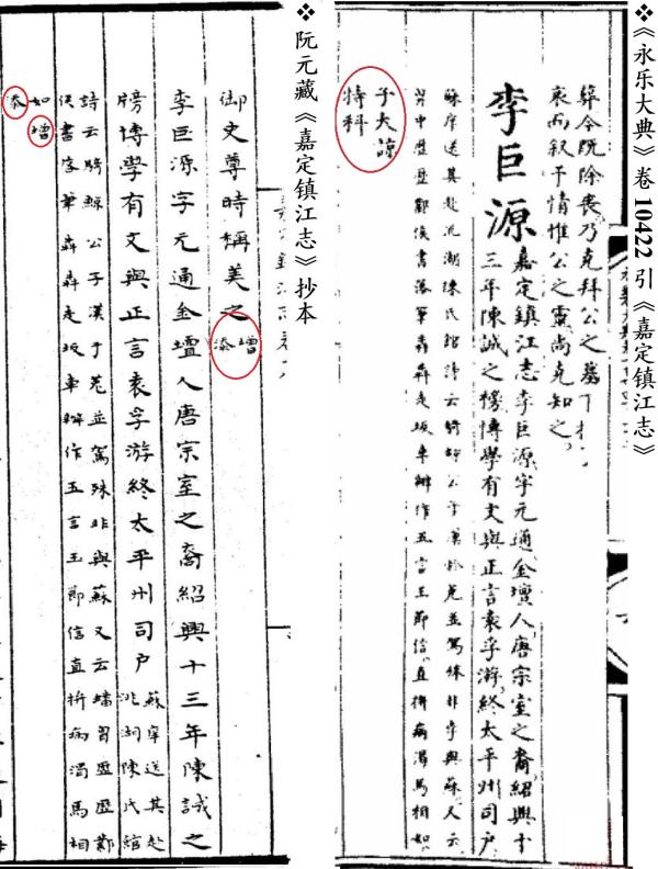 阮元曾委托刘文淇父子为之雠校,刘氏疑《嘉定镇江志》《至元镇江志》二书自《大典》录出,未作精细论证。他综合校勘结果推定,“疑二书亦从《大典》中录出,馆臣曾见是书而未经编定,故有宋志断烂而以元志补之者,有元志淆讹而以宋志羼入者,有子注而误为正文者,有子目而混为总类者”(同上,2567页)。查检现存《大典》残卷,其中引及《镇江志》,朱笔标示书名有二种,一为“嘉定镇江志”,二为“镇江志”。匆匆翻看阮藏《嘉定镇江志》抄本,尤值得注意的是,卷十七、十八的“人物”志中有十五六篇小传,末标“增添”二字。复检《大典》现存残卷,幸存卷3149陈字册、卷10422李字册引及陈东、李巨源二篇小传,恰可取与对勘。具体而言,以李巨源小传为例,《大典》引《嘉定镇江志》以后,又以双行小字引“苏庠送其赴洮湖”等文字。阮藏《嘉定镇江志》抄本也保留了双行小注这种形式,且最末标示“增添”二字(漏辑《大典》此条末“子大谅,特科”五字)。