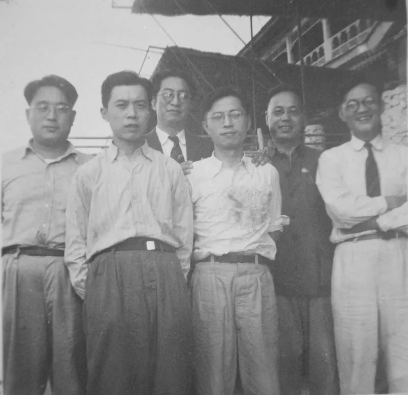 1949年7月第一次文代会期间,巴金与李健吾等友人摄于北京北海(左起:靳以、陆申、郑振铎、曹禺、李健吾、巴金)