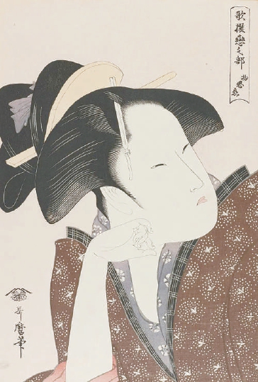 通俗美中绕不开的话题便是美人。在浮世绘画家中,喜多川歌麿以描绘美人见长,著名的作品有《妇人相学十体》和《青楼美女》,其作品《歌撰恋之部·物思恋》表现的就是美人在恋爱中思念爱人的状态。