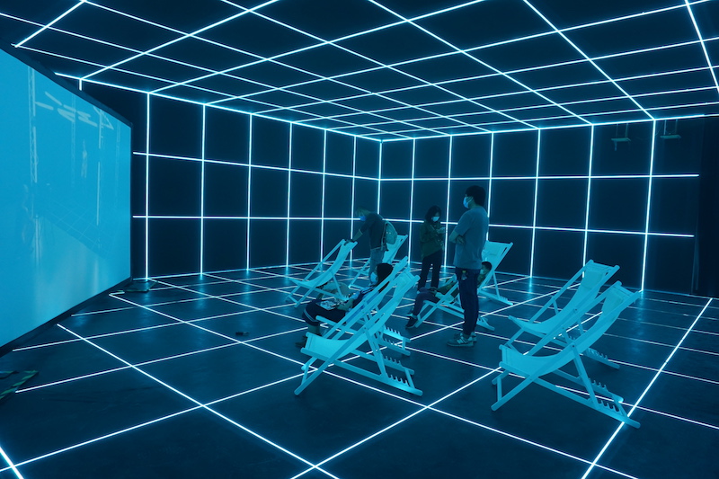 在蓝色的灯带构成的空间里,摆放了很多的躺椅,大屏幕上播放的影像和在场的观众是一个双重的隐喻:工人们在动作捕捉工作室中,不断地运动以产生人工阳光。在这件作品中,太阳象征着权力和能量;而大众,就像那些工人一样,在数字化的现实中,以一种匿名化的、原子化的方式存在着。