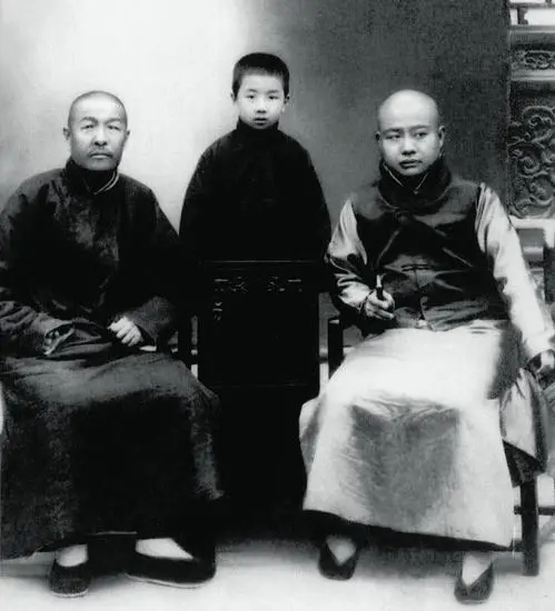 现存最早的启功先生照片,约10岁时与祖父毓隆(左)和姐丈(右)的合影。