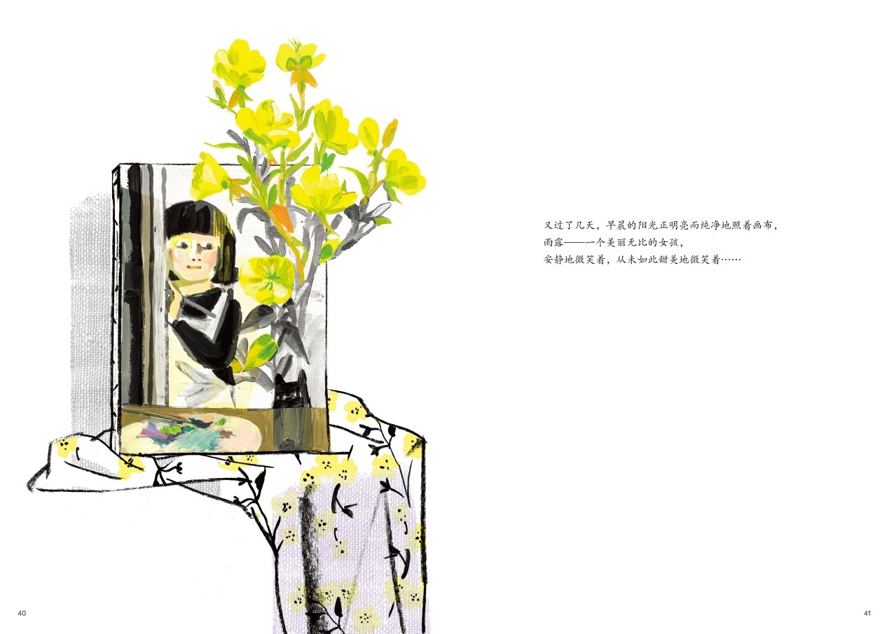 神奇的事情发生了……女孩得到了画布的认可,画布上盛开出最美丽的自画像:雨露——一个美丽无比的女孩,安静地微笑着,从未如此甜美地微笑着……