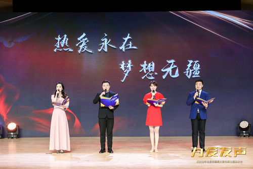 北京广播电视台主持人李锐、靳桥与获奖选手代表孙雪丽、王祎磊