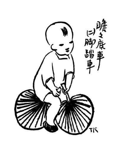 子恺先生艺术之独特在另一方面——独树高标,表现童心童趣,抒情融入诙谐,展示了一种美学境界。此类经典之作大多收集于《儿童相》。令人过目不忘者如画孩子持两蒲扇,一前一后,作骑马状,题曰“瞻瞻的脚踏车”;孩子将自己的鞋子垫于四脚圆凳之下,题曰“阿宝两只脚,凳子四只脚”。于儿童经验之局限写其心灵之天真,于不起眼的、平常人视之无所谓的现象中发现童心之美。还有一幅令人印象深刻,三个孩子,一女稍高,立于中,左侧男孩,戴英式礼帽,甚大,右侧女孩,头蒙面布,题曰“软软新娘子,瞻瞻新官人,宝姊姊做媒人”。其事极不现实而孩子极慎重,于儿童显示童心童趣,于画则表现了先生的爱心和幽默。
