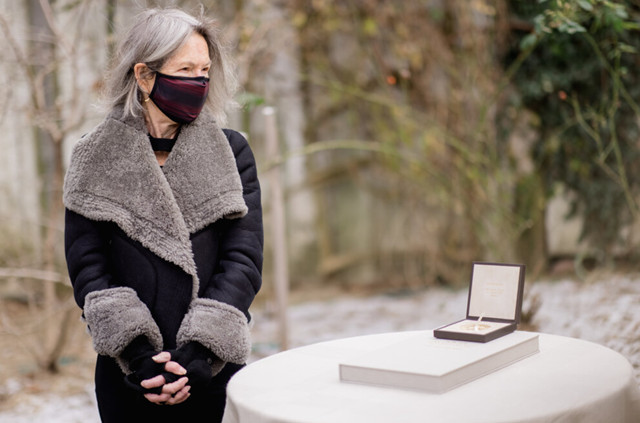 露易丝·格丽克在美国马萨诸塞州剑桥家门外的花园里接过了诺贝尔奖章,并发表了获奖感言。 图片来自诺奖官网,Daniel Ebersole 摄